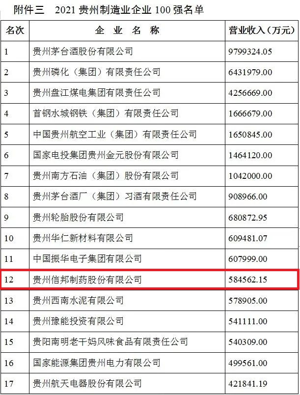 信邦集团以58.46亿元的营业收入与稳健的综合实力位居“贵州企业100强”榜单第34位、“贵州民营企业100强”第5位以及“贵州制造业企业100强”第12位。